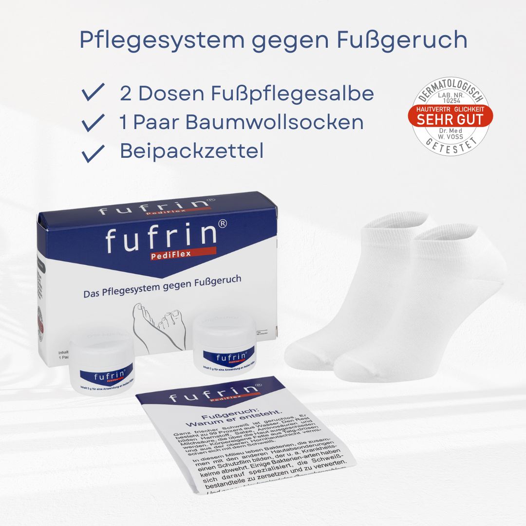 Eine Packung enthält 2 Tiegel mit je 5 g Fufrin Fußsalbe für jeweils eine Anwendung an beiden Füßen, ein Paar Baumwollsocken und eine Anwendungsbeschreibung.