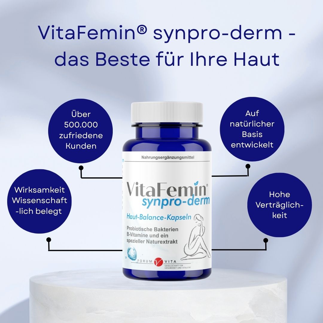 VitaFemin® synpro-derm präsentiert eine einzigartige Produktformel, welche die Haut von innen stärkt und schützt.