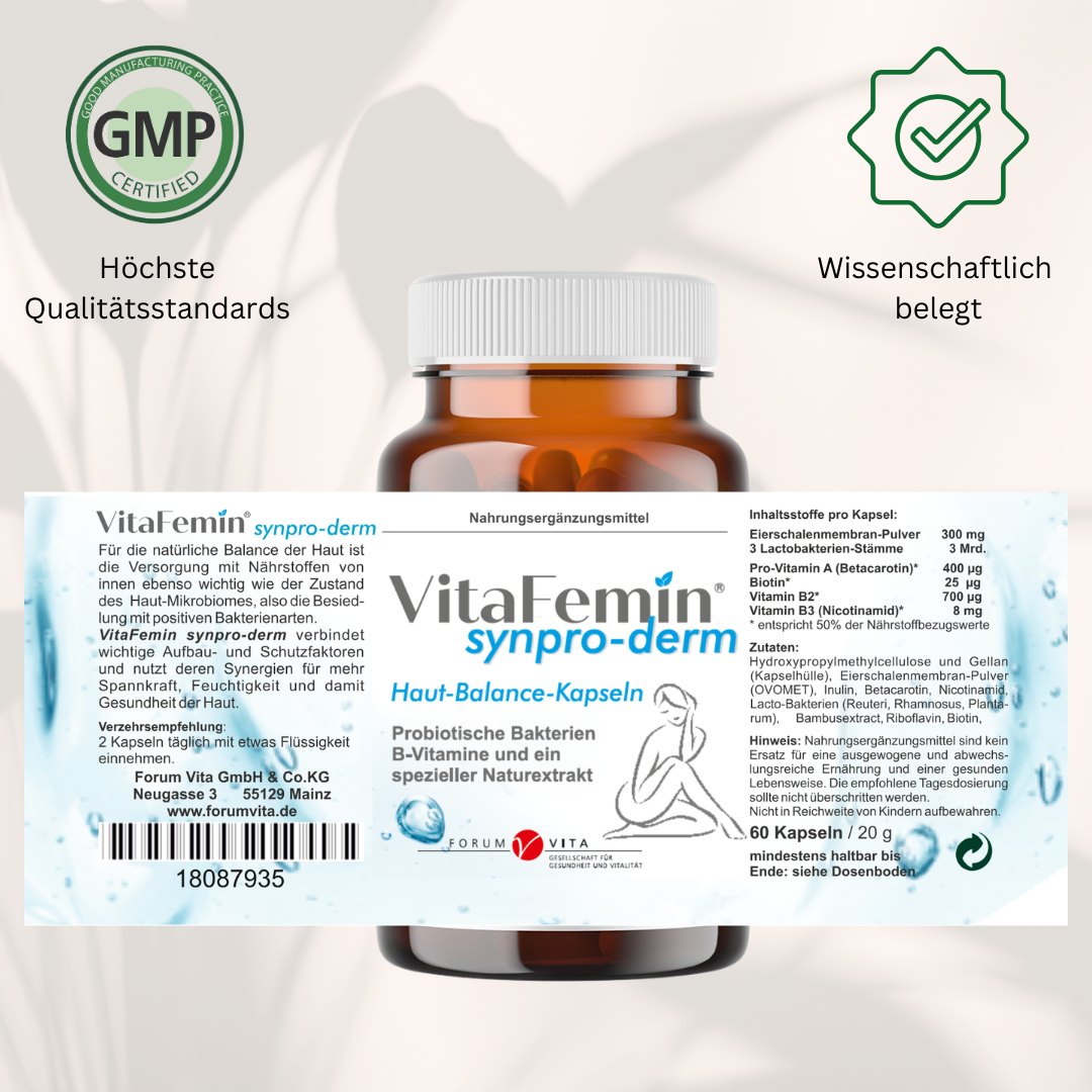 - Feuchtigkeitsregulierung und Hautstabilität: VitaFemin® synpro-derm fördert die Feuchtigkeitsbindung,